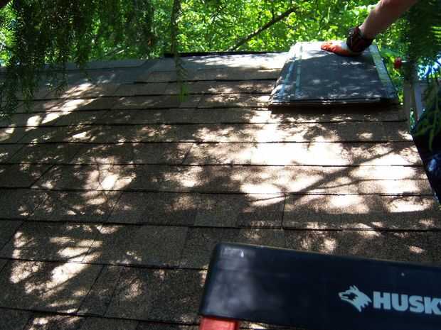 Las tejas en el techo con clavos a partir de la parte inferior del material para techos del clavo fo el techo y trabajando su manera para arriba. Utilizar las muescas en las tejas para medir la cantidad de traslapo. Cada pocas hileras usan una cinta métrica para asegurarse de que estas filas están siendo rectas. Al llegar dentro de un pie de la corona, desde la parte inferior del otro lado y suba otra vez.