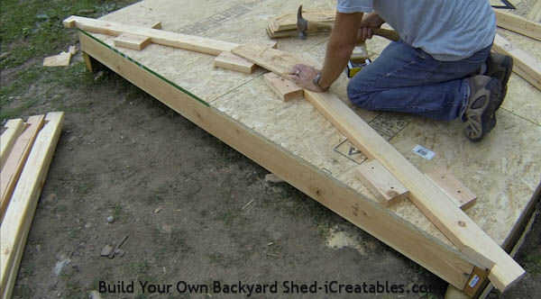 Clic en el enlace para un video, fotos e instrucciones sobre cómo construir vigas del techo: http://www.icreatables.com/sheds/how-to-build-shed/shed-rafter-build.html