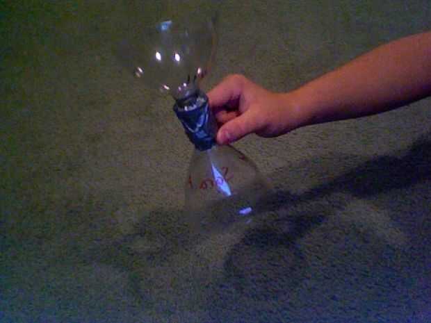 Usted debe tomar los pedazos del dos cuello que han salvado y asegúrelas con cinta adhesiva.  Poner la cinta alrededor de ellos para asegurarlos y botella aberturas juntas.  Mira la imagen para ver como se ve.