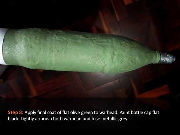 Aplicar capa final de plano verde oliva a la cabeza. Tapa de la botella de la pintura negro mate. Ligeramente coloree dos ojivas y fusible gris metalizado.