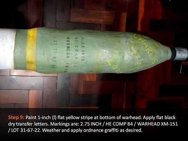 1-pulgada de pintura amarillo plano (l) de la raya en la parte inferior de la cabeza. Aplicar Letras de transferencia en seco negro plano. Las marcas son: 2,75 pulgadas / B4 COMP / OJIVA XM-151 / lote 31-67-22. Tiempo y aplicar graffiti artefactos como se desee.