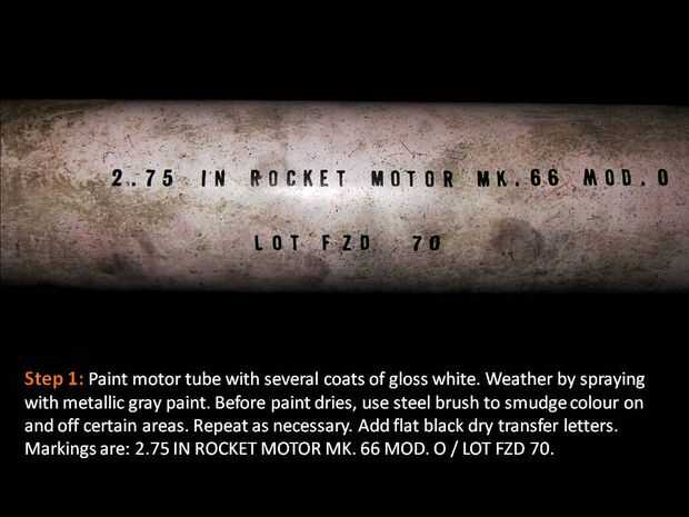 Pintura motor tubo con varias capas de blanco brillante. Tiempo de pulverización de pintura gris metalizada. Antes de la pintura se seque, utilice cepillo de acero para difuminar el color en ciertas zonas. Repita según sea necesario. Añadir Letras de transferencia en seco negro plano. Las marcas son: 2.75 en el MOTOR del cohete Mk 66 MOD. O / LOTE FZD 70.