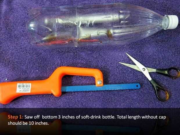 Sierra inferior 3 pulgadas de botella de refresco. Longitud total sin tapa debe ser de 10 pulgadas.