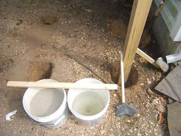 Con el primer puesto en la tierra, niveló con un nivel y apoyada en su lugar con restos de madera. Entonces, empecé a mezclar el concreto. Este proyecto tuvo tres bolsas de 50 lb de secado rápido concreto. Con el concreto mezclado a la consistencia correcta, derramó alrededor de la base del poste.