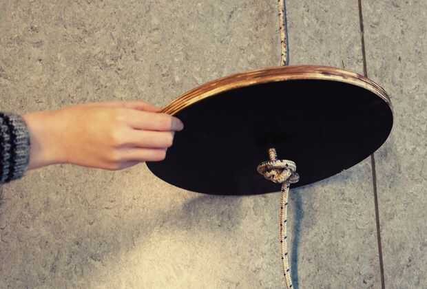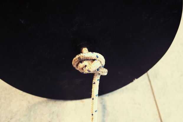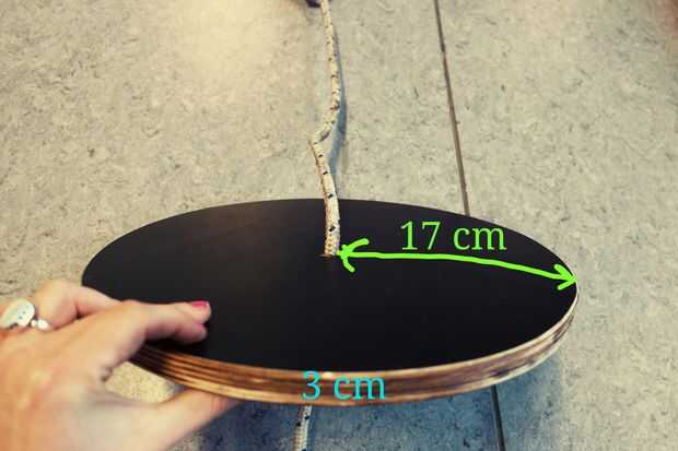 El asiento es la parte más difícil, porque tienes que usar alguna maquinaria eléctrica. Para crear un círculo perfecto, usé una lijadora (cuadro 2). También se asegura que la oscilación tiene ningunos filos. Para hacer un agujero en el medio, he utilizado un taladro de 10 mm (Foto 3 y 4), sólo lo suficientemente grande como para que la cuerda tirar a través. Para terminar, he hecho un gran nudo en la cuerda para asegurarse de que no se deslice el asiento.