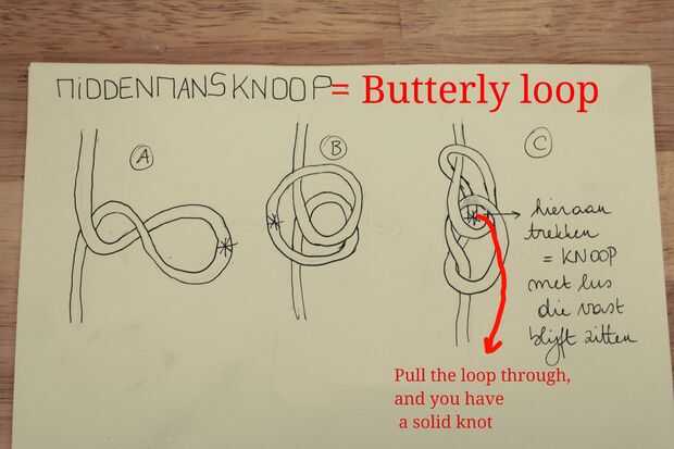 No todo árbol es del mismo tamaño, así que busqué una técnica para adaptar el giro a la altura correcta. Solución: un bucle puede fácilmente atar y atar otra vez si la altura no es muy buena, pero todavía se mantiene fuerte durante mucho tiempo. Muchos escaladores usan demasiado, porque usted puede atar en cualquier lugar que desee en un pedazo de cuerda. En holandés se llama 'middenmansknoop', lo mismo para el lazo de mariposa en inglés.