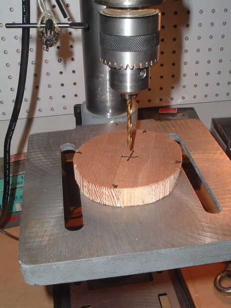 Quitar la placa base y perfore un orificio de 5/32" en el centro. Ponga un trozo de madera de desecho (no mostrado) debajo de la placa base para que la broca no golpee la mesa del taladro. Dejar a un lado la placa de base hasta un paso más adelante.