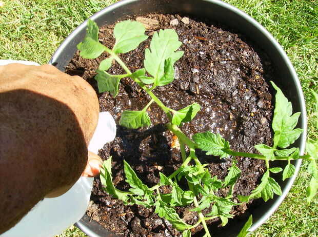 Wow! Muchas palabras para decir dos pintura de cinco galones cubos ponen juntos para tener una reserva de agua de respaldo en la parte inferior. Tomates crecerán muy bien en contenedores, pero no dejarlos secar incluso por un día. Te recomiendo un balde de 5 galones o más grande. Es muy difícil para no dejas secan tomates de envase. Quiere darte tres advanatages. La primera es utilizando un recipiente de 5 galones o más grande. La segunda es usando una mezcla de suelo de control de humedad y la tercera es utilizando este diseño de doble contenedor.