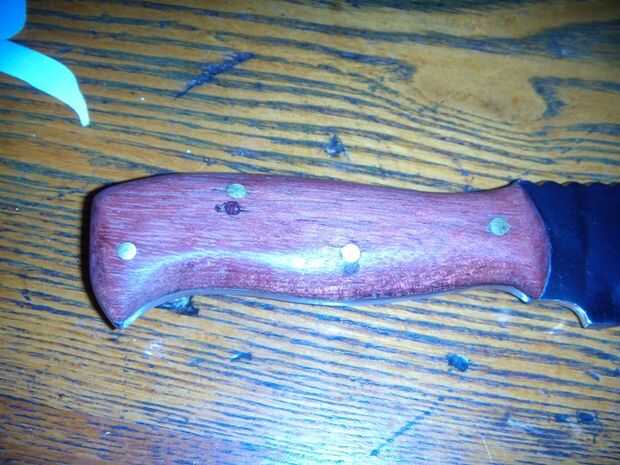 Bien, hay que ir. Un cuchillo terminado. Estoy contento con la manera en que salió, pero yo no soy inmune de errores. El cuadro dos demuestra mi error más atroces--cuando perforan los orificios a través de la primera losa de mango no dejar que el epoxi sistema completamente y la losa se deslizó antes de que perforé sin yo notarlo. Fue sólo después de tres de los agujeros que me di cuenta de que la madera no estaba cubriendo parte del mango había perforado. Por suerte uno de esos agujeros estaba en el lugar correcto, y era capaz de mover suavemente la madera en la posición correcta antes de que seca. Seguí con el proyecto y había disfrazado los agujeros con dos tapones de madera Purpleheart. Desde que tomé la foto la madera se ha oscurecido y los tapones se han convertido en un poco más mezclados con el mango. Tipo de gustan, añadir un poco a la hoja de personaje.