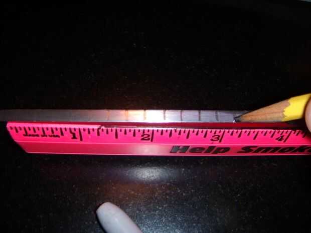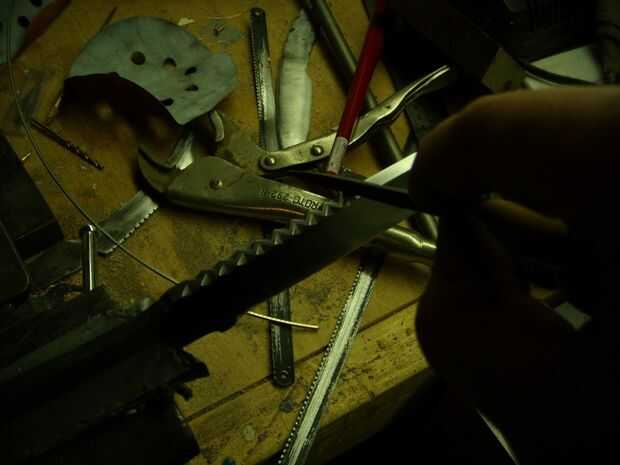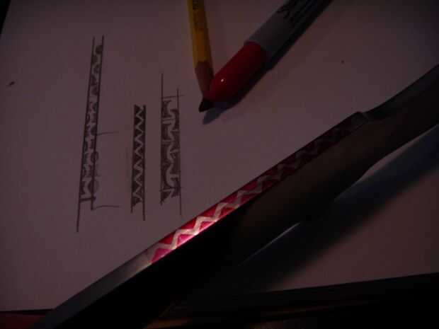 Ahora, para eso filework. Puede ver el proceso en las tres últimas fotos abajo. En primer lugar, elegir su diseño y marca espacios incluso por parte de la hoja a trabajar. En segundo lugar, dibujar el patrón en el cuchillo, uso de las marcas como guía. Elegí un patrón de zig-zag bastante simple, pero puede ver un par otras posibilidades en el cuadro tres. Hay literalmente infinitas posibilidades de filework, pero me gustaría probar una muy sencilla en un primer proyecto. Filework mala puede arruinar un cuchillo si no bueno. En la última foto se puede ver cómo presentar el patrón. Uso de archivos de la aguja. Es bastante simple; sólo tenga cuidado de no rayar el lado de la hoja. Lo hice en uno o dos lugares, pero posteriormente lijar los rasguños hacia fuera.