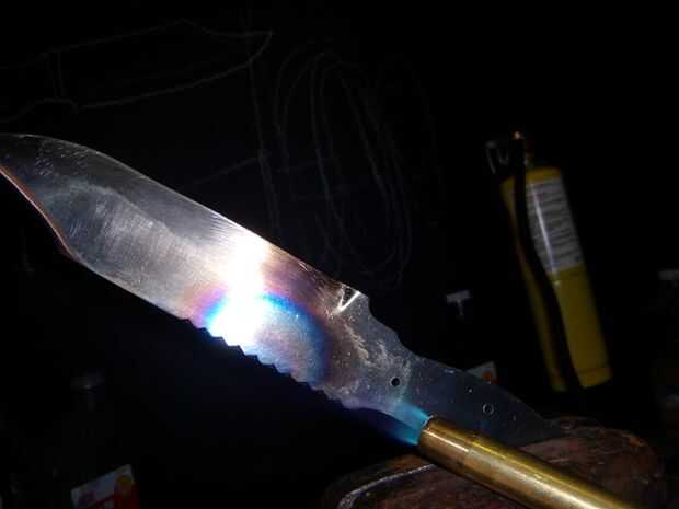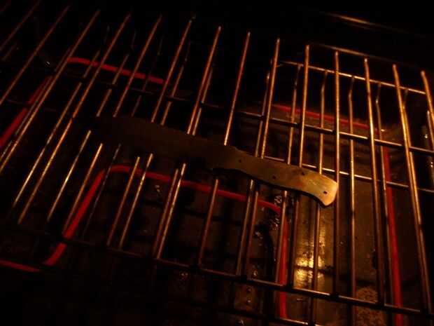 Ahora para empezar. Hacer un fuego en la fragua de carbón o gas o enciende tu antorcha--calor la hoja por la columna vertebral, para que no se queme el borde. Acero se quemar o derretir, transformándose en un mousse de metal espuma-como inutilizable si se calienta demasiado.