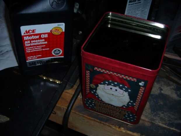 Ahora, necesita un baño de Temple. Para 01 acero, se debe usar aceite. Diferentes tipos de acero requieren diferentes métodos de enfriamiento--aceite de Temple, Temple de agua, aire quench, etc.... otra vez, recomiendo 01 acero porque es fácil de tratar del calor y no requiere nada más complicado que un cubo de aceite de motor. Véase el cuadro dos. Podrá sumergir totalmente la hoja. La segunda cosa que usted necesitará para el endurecimiento es un imán. Esto lo ayudará determinar la temperatura de Temple, porque en ese momento el acero se convierte en no magnético. Véase el cuadro 3 - mantener el imán en la campana de mi fragua, específicamente para este propósito.
