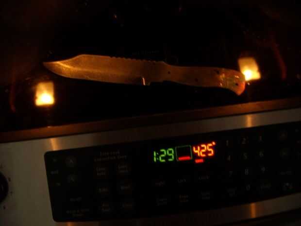 Ahora, no hay mucho que puedes hacer con la cuchilla hasta que se Temple. Apagar tu fuego, entrar y precalentar el horno. Podría haber llegado su acero con Temple información sobre ella. Si lo hizo, eligió la dureza de la hoja y que temperatura. Usted querrá una dureza media de un cuchillo. El cuadro undécimo de este paso es una ilustración de la Temple colores--son una ayuda visual para medir el temple de la hoja. A mayor temperatura, más suave y springier será la hoja. Trate de disparar por un color violáceo o marrón, que generalmente se presenta en cerca de 400-450 grados. Si no sabes exactamente qué temperatura usar, ir a 425 grados fahrenheit. Poner la hoja en el nivel medio y dejar cocer durante una hora. Cuando la hora para arriba, el cuchillo está listo. Felicidades. Oficialmente ha hecho una hoja--aunque para convertir la hoja en una fina pieza de la cuchillería, usted necesitará hacer un poco más trabajo.
