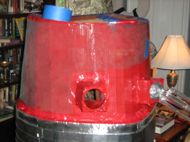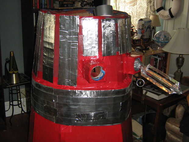 terminar encima de corta un pedazo de malla que envuelve lo dalek de justo por encima de la correa hacia arriba, asegurándose de que subir alrededor de los brazos. ahora 4 rectángulos de color plata que van desde justo por encima de los brazos hasta la parte superior y luego 11 los más que llegar desde justo por encima de la correa en la parte superior y pegar todo.