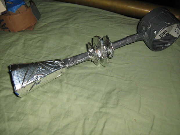 para el pedúnculo, hacer otro tubo y montaje de tres anillos en el medio, dos pequeños uno más grande y adjuntarlo a otro rollo de cinta vacía (por esta razón me sugirió cinta. luego hacer un cono que está abierto en ambos extremos y uno más pequeño en el tubo y poner una imagen del ojo del daleks en el extremo más grande. luego corta un agujero en la cúpula que lo fije y lo de las luces de montar dos pequeños conos les de color oro y pégalos en los lados.