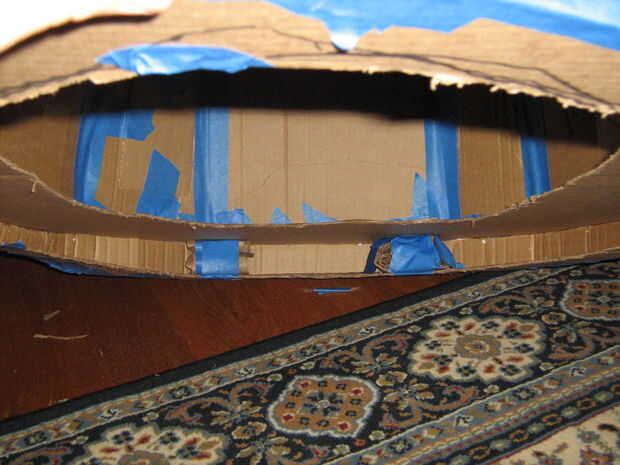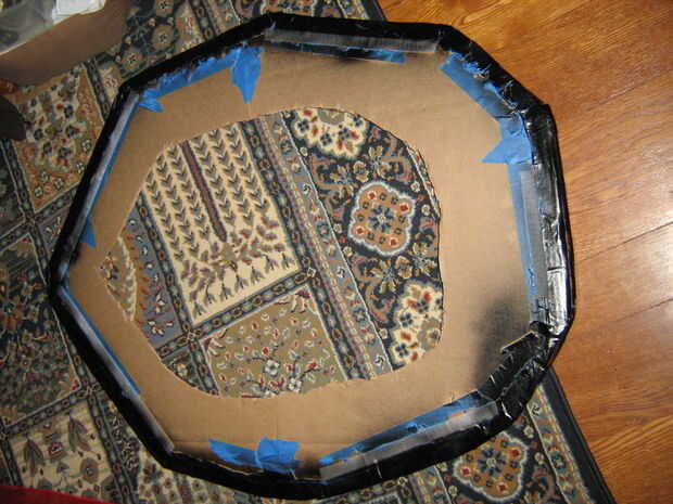 ahora, colocó la falda principal en dos hojas de cartón y trazar la falda dejando aproximadamente una pulgada entre la falda y el borde, luego cortar las dos hojas de cartón para que sean idénticos. ahora corte los interiores, dejando 2 pulgadas de ancho en una y cinco pulgadas de ancho en el otro. tener uno más grande que el otro deja instalar ruedas más adelante. papel hasta 5 pedazos de cartón y colocarlos entre las 2 piezas de la base, hacen una pulgada de alto. una vez que lo hace tomar una tira larga fina de cardboardand lo pegamento alrededor del borde externo. Finalmente, una vez que el pegamento se seque cubra el exterior en cualquier cinta negra de pintura o conducto.