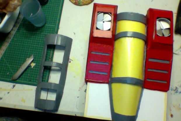 I cortar 2 círculos y simplemente cortar un patrón cruzado en ellos. He encerrado cada ventilador dentro de un anillo de cartón y luego lo pegan en el interior de las cajas a ambos lados de la cabina.
