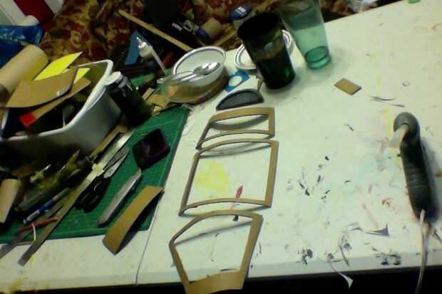 una vez cortadas de cartón, pegué el acetato amarillo en el interior. Luego tomó algunas tiras cómicas de cartón y pegado en el interior de acetato para darle alguna solidez. (Foto 3)