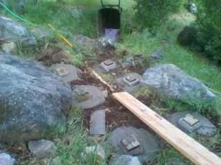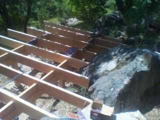 start by laying out your piers. excavar unas pocas pulgadas a fresco sin tocar tierra. no demasiado profundo. salir las esquinas todo apoyado cuadrado ellos pueden ser diferentes elevaciones. medir desde la parte superior del muelle a su altura final, luego reste el 2 x 4 ancho y la remander será la altura de su 4 x 4. lo que a las cuatro esquinas. Tome una tabla recta y fijar en los postes de 4 x 4, estén todos los niveles cuando sean nivel y Plaza de virar hacia abajo de la viga, deja que cuelgue más allá de sus esquinas unos 1' 1/2 más o menos. OK luego tomar sus muelles centro y tachuela centro de colgar de la viga y una madera rápida forman por debajo y alrededor de él entonces verter el hormigón alrededor y bajo muelle hasta hormigón algunos pulgadas más alto y luego la parte inferior de su muelle, deje secar para el día.
