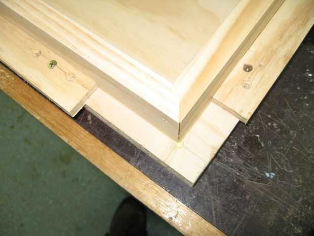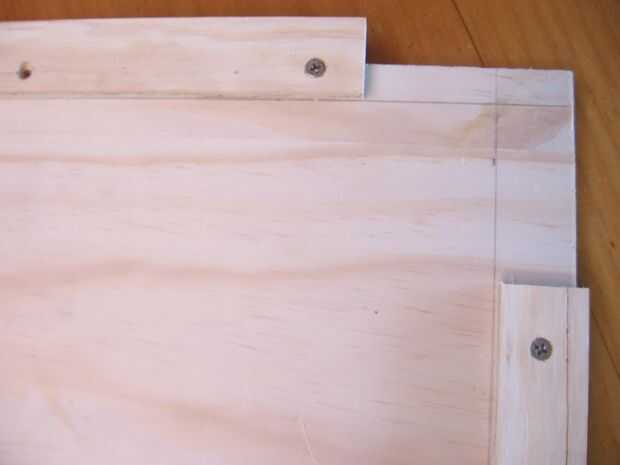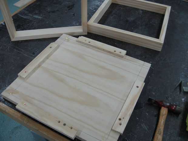 Porque este proyecto requiere varios fotogramas idénticos para las bandejas y la base, tenía sentido para hacer una 'plantilla' – una pieza de aglomerado de chatarra que yo entonces algunas capas para. Esta plantilla le permite obtener los fotogramas casi perfectamente cuadrados, que las discrepancias sean uniformes y proveer algo para sujetarlo mientras se golpea con un martillo.