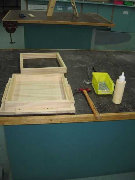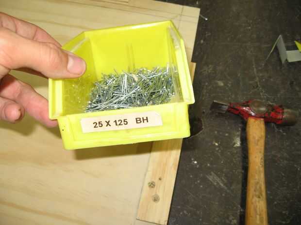Una vez que tienes trabajo bien, y los lados todos colocan, colocar pegamento en ambos ángulos de dos de los lados que encajen en la plantilla y empezar a fijar las esquinas con clavos finos. Utilicé dos clavos en cada esquina, uno de cada lado, perpendicular entre sí, esto evita que las esquinas que aparte como si tire en la dirección de un clavo, el otro es perpendicular y no tire.