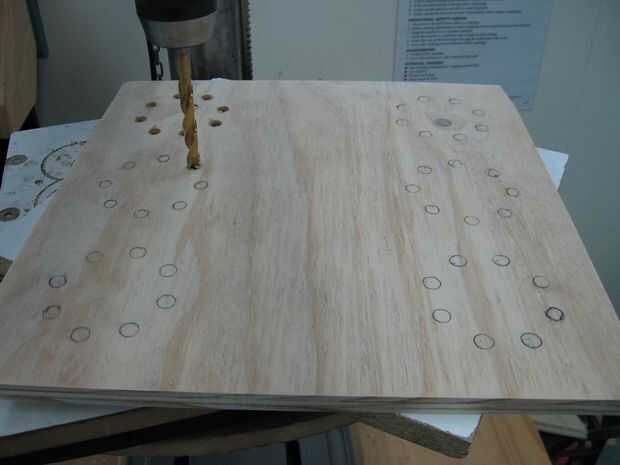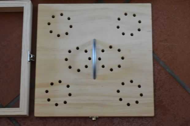 Para la base, tomé uno de los marcos que también podrían ser una bandeja y orificios de 10mm cuatro en el fondo, en un patrón que me ha permitido para el deshidratador sobredimensionado en la combustión lenta.