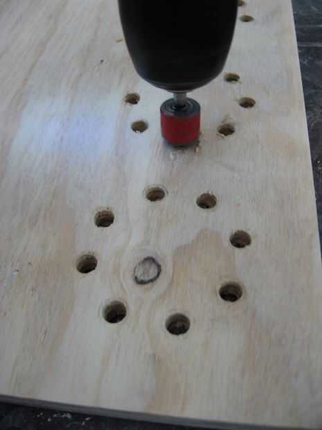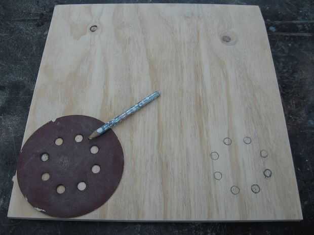 La tapa tiene un montón de agujeros para permitir flujo de aire hacia arriba a través de los estantes, que se seca el contenido. Para asegurar que tengo diseño del agujero simétrico que usé lo que tenía en mano, el disco de una lijadora orbital. Esto me dio ocho agujeros de 9mm para utilizan seis grupos de ocho.