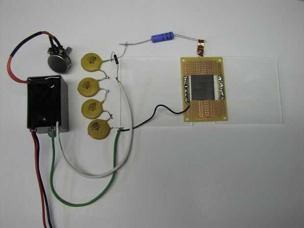 La placa de metal de alto voltaje tiene dos 1/8 plazas plástico junto a ella. La placa de prototipado se basa en los cuadrados de plástico como se muestra. Los cables se colocan aproximadamente 0,1" por encima de la placa metálica.