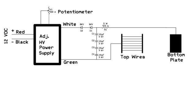 Usted puede comprar una fuente de alimentación de alto voltaje estándar ajustable conveniente para este proyecto, ver lista de piezas. Usando la fuente de alimentación que conectar nuestros componentes como se indica en el esquema, Foto de configuración se muestra a continuación.