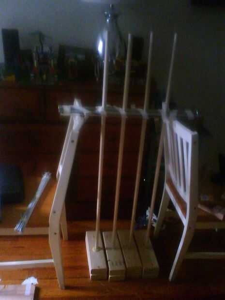 Use un nivel y algunas sillas y escobas o lo que puede para mantener rectos los tacos como se secan. No es super importante, pero el más liso mejor.