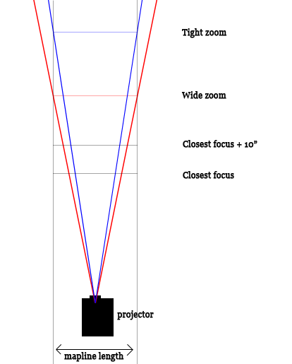 1 - proporciones del tiro: en la siguiente imagen hay dos ángulos de proyección - el zoom amplia y el zoom ajustado. Porque la su longitud mapline es fijo, la longitud de la proyección está determinada por relaciones de tiro de su proyector.