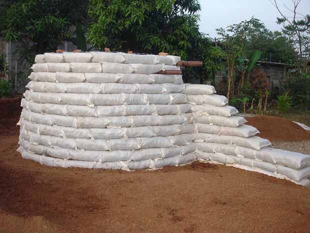 Continuar construyendo el contrafuerte al mismo tiempo como la cúpula. Las bolsas y el alambre de púas del dispositivo de seguridad en cada curso. Hemos añadido unos ½" piezas de varilla para mayor resistencia, donde parecía haría la mas buena: a través de la parte superior de las bolsas para ayudar a prevenir vuelcos, y donde los contrafuertes conectan a la cúpula. Los contrafuertes son pisados para que coincida con la pendiente de la tierra. Los pasos facilitan el subir a la cúpula. La parte inferior hace un buen Banco.