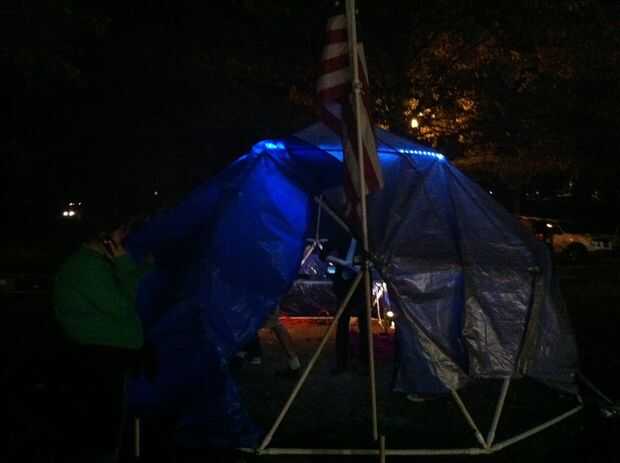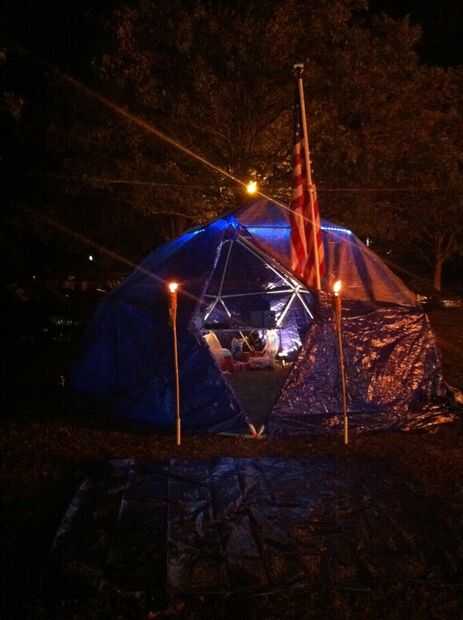 Las lonas finalmente montar junto con un montón de doblar, rodar y cinta aislante. Nosotros también despegó un solo puntal para hacer una puerta.