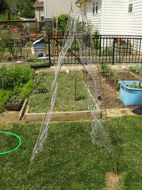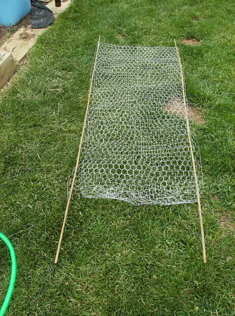 Siga la imagen de abajo y cuatro postes de bambú para tejer los lados del alambre de pollo. Inserte el poste, a partir de la parte inferior y el polo de la armadura a través de cada agujero de 5 º o 6 º. No necesita ser exacta. Dejar aproximadamente 2 pulgadas de caña de bambú encima de la rejilla (donde es la curva) y dejar el resto de la longitud en la parte inferior. La longitud de poste exceso es lo que es insertado en la tierra de jardín. Compra de alambre de pollo es de 10 pies necesita altos postes de bambú. Los postes de bambú en este enrejado son 6 pies. Cada lado de la rejilla es de 5 pies. Deja espacio extra para los postes de bambú que se extienden más allá de ambos extremos del alambre de pollo.