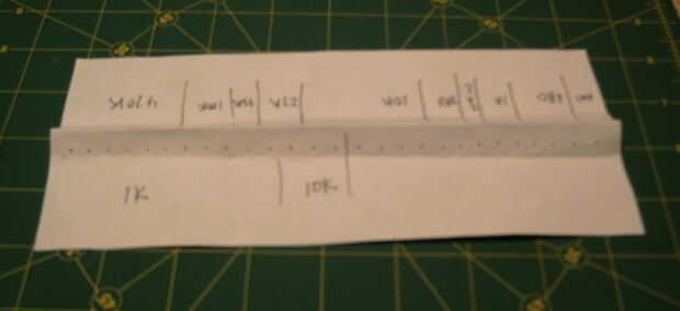 Luego cada valor de resistencia del clip y forma con la herramienta #2 la forma de las piezas. Cada valor debe estar separado, así que hacer un soporte de papel doblado que asoman los agujeros, que pongo cada resistor en. Perdón por la foto pobre mi cámara tiene problemas con blanco.