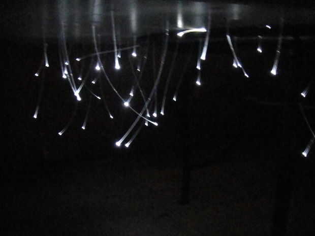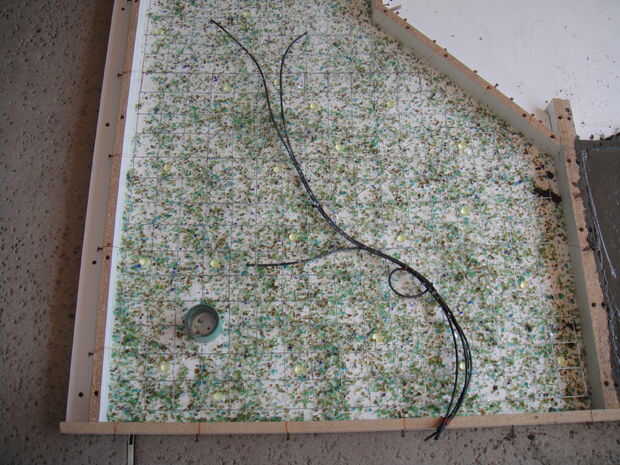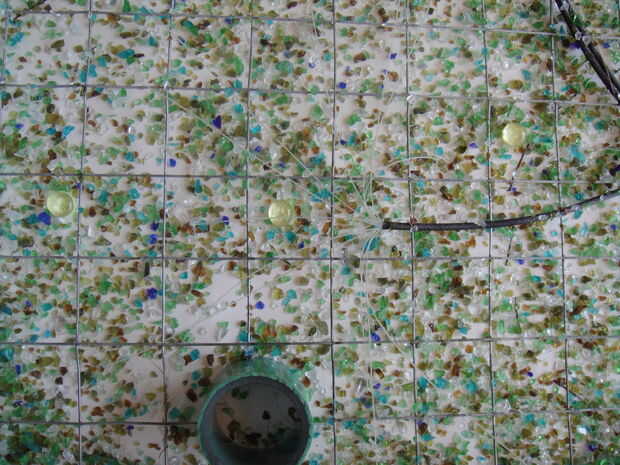 Ahora es el momento de añadir tanto el apoyo de malla de alambre (yo usé K-listón) y cualquier vidrio triturado decorativo u objetos incrustados que desea estar expuesto en la superficie de la mesa más tarde! También colocar los orificios que desee en el escritorio más tarde. envolver un trozo de tubo de PVC con espuma fina de algunos, luego cubrir con cinta para hacer una forma del agujero del embalaje. Se toque la tubería libre de la espuma, entonces usted puede pelar lejos la espuma/cinta. Utilice un cable para suspender la malla 1" por encima de la superficie de la forma. Esto Coloque exactamente en el centro concreto. Quería algún vidrio machacado, así que compré algunos verde, vidrio claro y marrón, así como gotas de cristal de uranio. botellas recicladas pueden ser una buena idea, otras rocas u otras monedas u otros objetos interesantes también pueden trabajar bien! las posibilidades son infinitas. También compré algunos fibra ópticos cables a integrar en el escritorio. Perforar algunos agujeros pequeños a través de la melamina, inserta una fibra y luego caliente lo había pegado en el otro lado. cable de las fibras y cables antes de verter. reunir el paquete de fibras en el otro extremo al entrar en una caja de luz más adelante. refractarios sin forma y pulido que se ven como las estrellas en la superficie de la mesa. Utilizar spray adhesivo para fijar el vidrio en el molde por lo que no Haz empujados por el hormigón.