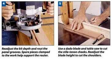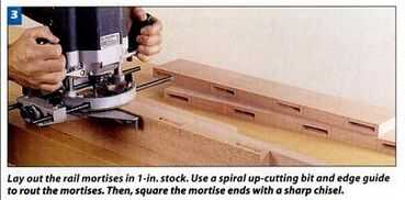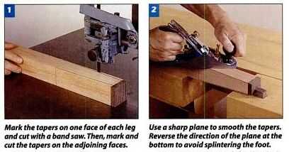 La mesa se compone de dos unidades de pedestal con cajones. Los pedestales se unen en la parte delantera por un montaje llamado el panel de la modestia. Corte acción 2-pulg-cuadrado para las patas de la mesa a la longitud exacta. A continuación, utilice la sierra para cortar los perfiles cónicos en la parte inferior de cada pata (Foto 1). Alise la superficie aserrada con un plano de la mano fuerte (Foto 2). Hacer los rieles y largueros de 1 pulgadas stock y colocar las juntas de mortaja y espiga. La derrota de la mor tises usando carriles extras fijadas al lado de cada pieza para proporcionar soporte de router sólido (Foto 3). Plaza las mortajas con un formón afilado. Reajuste la profundidad de bits de router y derrota las ranuras de panel en los carriles y montantes (foto 4). Utilice un disco de moldurar en su mesa de sierra para cortar las espigas stile (Foto 5), y luego pruebe la colocación de las articulaciones.