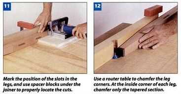 Permita que la tira de ribete 13⁄16 pulg. de ancho para el panel en las caras superior e inferior de la proyección. Después de establece el pegamento, uso un plano afilado para recortar los bordes al ras. Marque las muescas en los paneles inferiores y Camilla y hacer los cortes en la Sierra de banda. Coloque las ranuras de la placa de Unión en las patas del escritorio, modestia panel y pedestal. Utilizar bloques espaciadores por debajo de su ensambladora para localizar las ranuras en las piernas y los bordes del panel (foto 11). Fijar una guía de borde recto a los lados del pedestal interior para localizar la ensambladora cuando corte las ranuras para la modestia uniones de paneles. De diámetro y avellane los agujeros en los lados del pedestal interior para sujetar el panel de la modestia. Utilice una broca de chaflán en la mesa de fresadora para dar forma a los bordes de las patas del escritorio (foto 12).