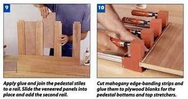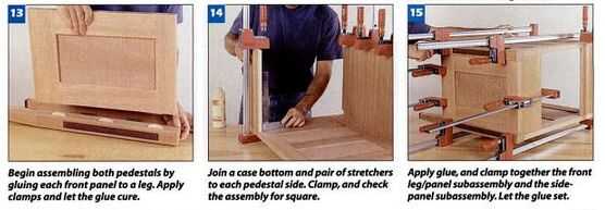 Tenga en cuenta que el interior esquina de cada pata debe dejarse cuadrado desde el extremo superior a una altura de 8. Cortado wenge tiras de recorte a la medida y Bisele los bordes con un fuerte bloque plano o bloque de lijado. Lijar las superficies de la pierna y wenge tiras a grano 220, luego marque el contorno de cada tira en las piernas con marcas de lápiz de luz. Esparciremos una fina capa de pegamento en la parte posterior de una tira y sujete en su lugar en una pierna. Después de unos 20 minutos, retire con cuidado cualquier exceso de pegamento. Repita para cada tira de wenge. Comenzar cada conjunto de pedestal pegando las patas delanteras a la parte frontal (Foto 13). Entonces, Únete a la parte inferior del pedestal y camillas a uno de los lados del pedestal (Foto 14). Después de establece el pegamento, agregue el lado opuesto a la Asamblea.