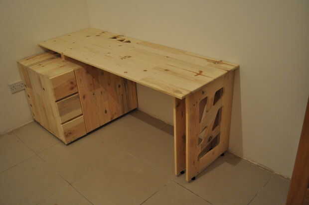 Así que decidí construir un escritorio de paletas que se iban a tirar. Este escritorio está diseñado para albergar un equipo en el futuro por lo que tiene un gabinete con orificios que actúan como conductos de ventilación. Para agregar un estilo, en lugar del panel plano generalmente como un lado, pierna, se utiliza un diseño de malla.
