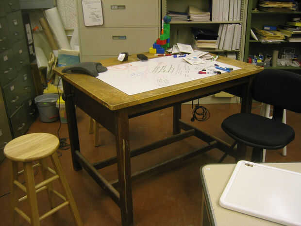 Por ejemplo, mi habitación tiene un rincón incómodo en el lado solamente con la ventana; en concreto, tengo un radiador en el suelo sobresale unos 6" de la pared y un travesaño de la ventana por encima de él sobresale aproximadamente 3" de la pared. Estos requisitos físicos significan que mis patas de la mesa debían estar en desde el borde de la superficie de la mesa del 95% de las mesas que se pueden comprar. En segundo lugar, funcionalmente quería una mesa que se adapte al tipo de trabajo, que incluye cosas como dibujo, lectura, xacto knifing papel, así como trabajo importante del ordenador portátil. También me echaba de menos la superficie y la altura de las mesas de estudio de arte de mis días de colegio. Por último, estéticamente quería una tapa de tabla, en el estilo de mesas rustico/taberna, y estaba dispuesta para el comercio de algunos nivelación superficial para esto.