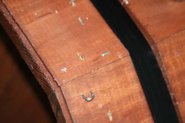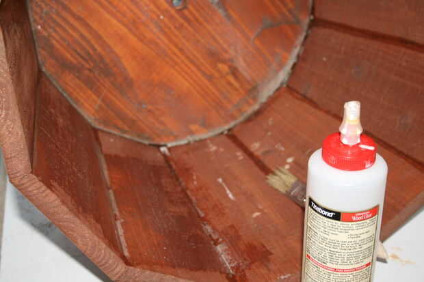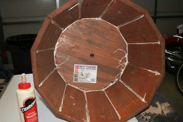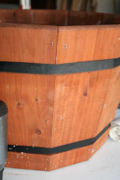 El cañón se ve reforzado mediante la aplicación de una buena cantidad de pegamento en cada una de las articulaciones. Ayuda a separar cada panel ligeramente para que el pegamento fluya dentro de la articulación. Después cada articulación ha estado bien cubierta, hacia los anclajes. Se sugiere el uso de una pistola de clavos/grapas neumática porque es rápido y más preciso. Pero si no tienes acceso a este tipo de herramientas, clavos de acabado de una caja de 1 1/4" y un martillo lo. Si usted utiliza un martillo y clavos o tornillos, sugiero pegar una sección en un momento y clavar o atornillar cada articulación como vas. Recuerde garantizar también la parte inferior de la barrica a los lados todo el camino alrededor con clavos o tornillos. Si debe usar tornillos, intentar encontrar tornillos de acabado porque la mayoría de los tornillos serán muy visibles.