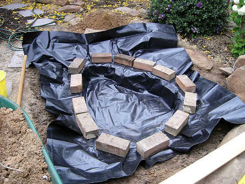 Pone el revestimiento sobre el agujero. Trate de no arrastrar el forro alrededor de demasiado, pero con un pequeño drapeado y paciencia, puedes conseguir una mirada aseada con el revestimiento. Me quité mis zapatos y pasó algún tiempo empujando suavemente en todas las esquinas y haciendo algunos pliegues iniciales. Puede que desee utilizar algún conducto de vinilo negro cinta abajo algunos de los pliegues como hice para hacerlos menos sensibles. Usar ladrillos o piedras para sujetar el forro abajo cuidadosamente todo el estanque.
