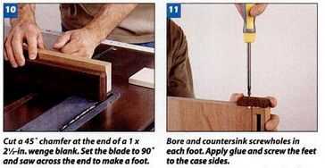 Instalar un chaflán en la mesa de fresadora y corte el chaflán de 1⁄8 de pulgada en los bordes frontales y exterior bordes posteriores de los costados de la cajas. Luego biselar las barandillas delanteras y los bordes delanteros de los estantes ajustables. Instalar una escalera en su router y corte el rebajo alrededor de los bordes de los paneles posteriores (Foto 9). Para hacer los pies de wenge, primero corte una tira de 1 pulg de espesor wenge a 21⁄2 pulgadas de ancho. Ajuste la hoja de Sierra de mesa a 45 ° y bisele el extremo de la tira (foto 10). Reajuste la hoja a 90 ° para cortar un pie de 1⁄2 pulg. de altura de la tira. Repita el procedimiento para las patas restantes. De diámetro y avellane los agujeros en los pies caso. Separó un poco de pegamento en cada pie y sujételos a los extremos inferiores de los lados con 11⁄2. No. 8 tornillos (foto 11).