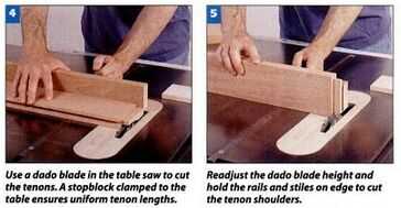 Luego, la derrota de las ranuras del panel posterior (Foto 2). Extienda las mortajas en los bordes de la parte superior e inferior traseras carriles. Mantener configuración de guía de borde anterior del router y vuelva a ajustar la profundidad para cortar estas mortajas. Abrazadera de dos rieles para proporcionar una base más amplia, más estable para el router, pero asegúrese de registrar a la guía contra la cara exterior de la baranda a cortar. Vuelva a ajustar la profundidad de bits para cortar las ranuras de panel en los rieles y luego de la derrota las ranuras de panel en los montantes traseros. Plaza las mortajas con un cincel afilado (Foto 3). Uso un disco de moldurar en su mesa de sierra para cortar las mejillas de espiga en los carriles y montantes (foto 4).