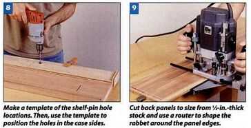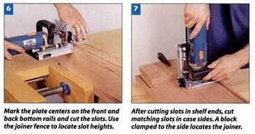 A continuación, coloque las ranuras en los bordes y extremos del estante inferior y cortarlas. Utilice una mesa plana como superficie de inscripción para la localización de las ranuras. Asegúrese de que mantener el instrumento y la pieza de trabajo firmemente a la mesa al cortar. Utilice la misma técnica para cortar las ranuras en los extremos superiores de los lados de la cajas como en los bordes superiores del frente de rieles y posterior superiores. Marca los lados caso para indicar las posiciones de las ranuras para el estante inferior común, luego, corte las ranuras (foto 7). Abrazadera de un bloque de guía hacia el caso para ayudar a localizar el joiner para estos cortes. Haga una plantilla de contrachapado o aglomerado para las localizaciones del agujero de la plataforma. Tenga en cuenta que la distancia del borde al agujero es diferente para los orificios delanteros y traseros. Coloque la plantilla de lado cada caso y utilizar un tope de profundidad en la broca de taladro para agujerear los agujeros de perno de estante (Foto 8).