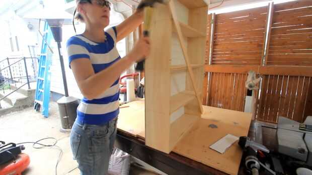 Justo después de que pegado y había clavado todo juntos, medí ambas diagonales fueron las mismas medidas. Asegura un pedazo de madera en la parte delantera para sujetar los estantes en su lugar mientras que fue estableciendo, al eliminarse una vez que el pegamento se creó.