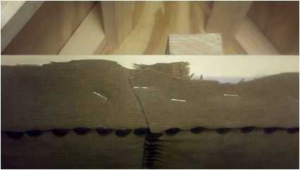 J. ahora tire el material tenso todo el camino alrededor de las heces de la costura a partir punto de engrapado como vas por lo que ahora es seguro en la parte superior e inferior el material lateral. (tenga cuidado de no ocultar los agujeros pies debajo)