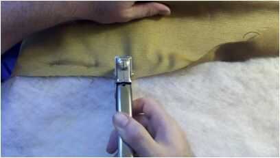 I. tirar el material ligeramente tenso en la costura y sujetarla por debajo con unas grapas.