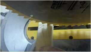 C. lugar marcado cara Junta a inglete mesa de la sierra y contra "la cerca" y sin encender, bajar hoja para verificar la exactitud del corte (Asegúrese de que la cuchilla está en la línea).